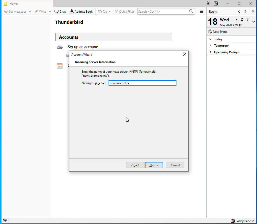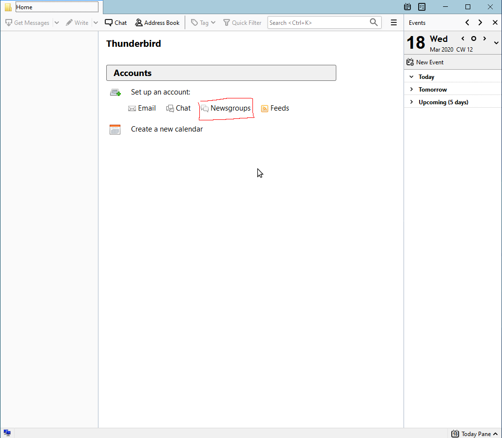 Thunderbirdi avalehelt saab luua uue serveri profiili, "Newsgroups" valik alltoodud pildil: