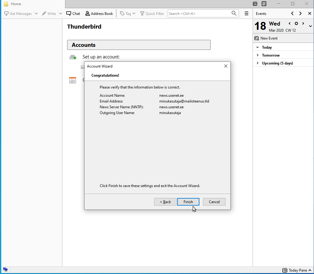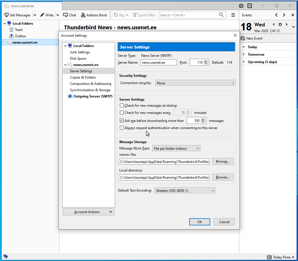 Antud pildil on näha "Connection security", see tuleks märkida "SSL/TLS", kui Sul on sisselogimiseks konto. Lihtsalt ilma kontota lugemiseks on vaikimisi sätted kiiremad ja töökindlamad.