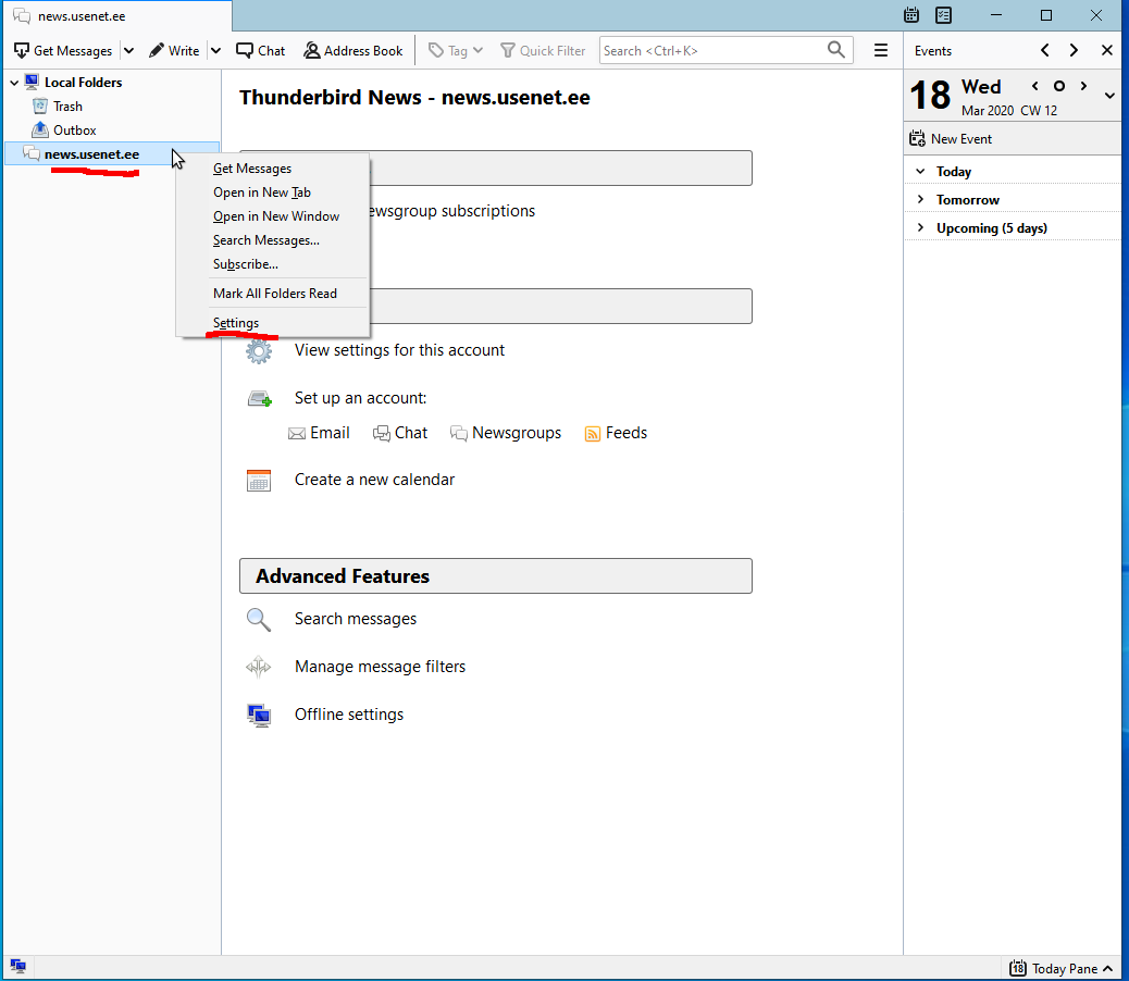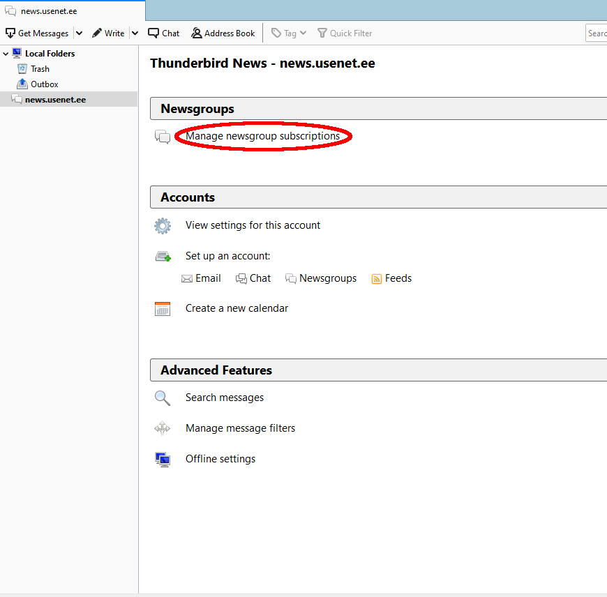 Uudisgruppidega liitumiseks vali "Manage newsgroup subscriptions":